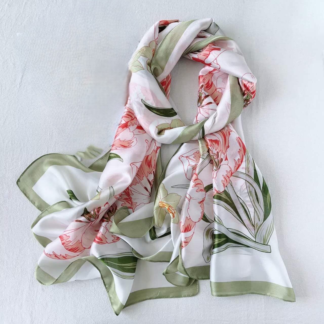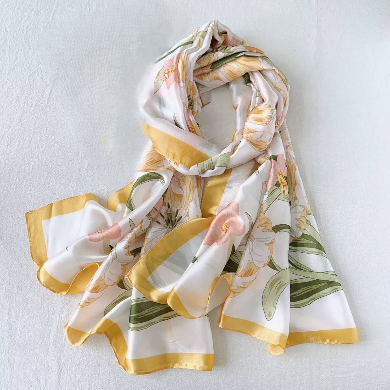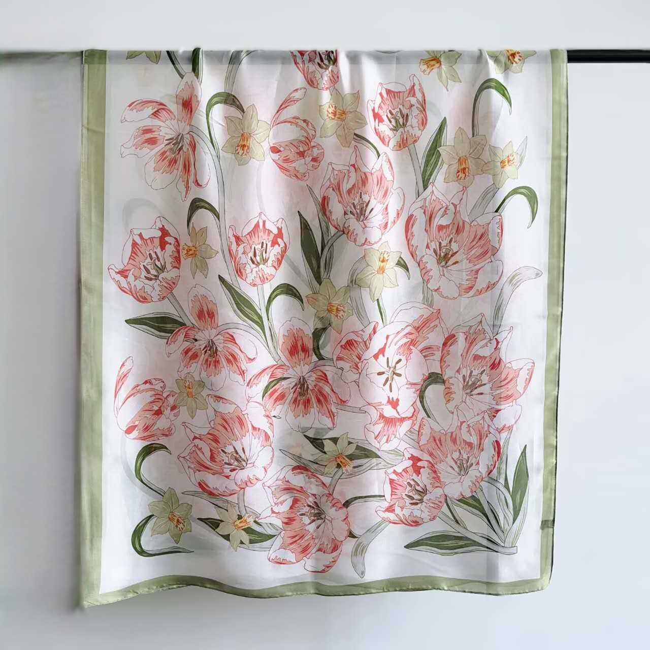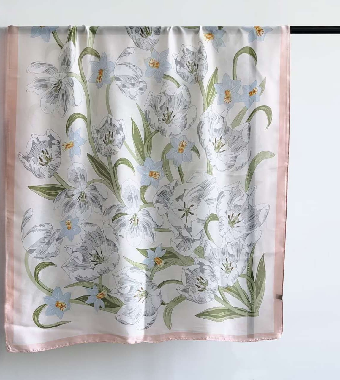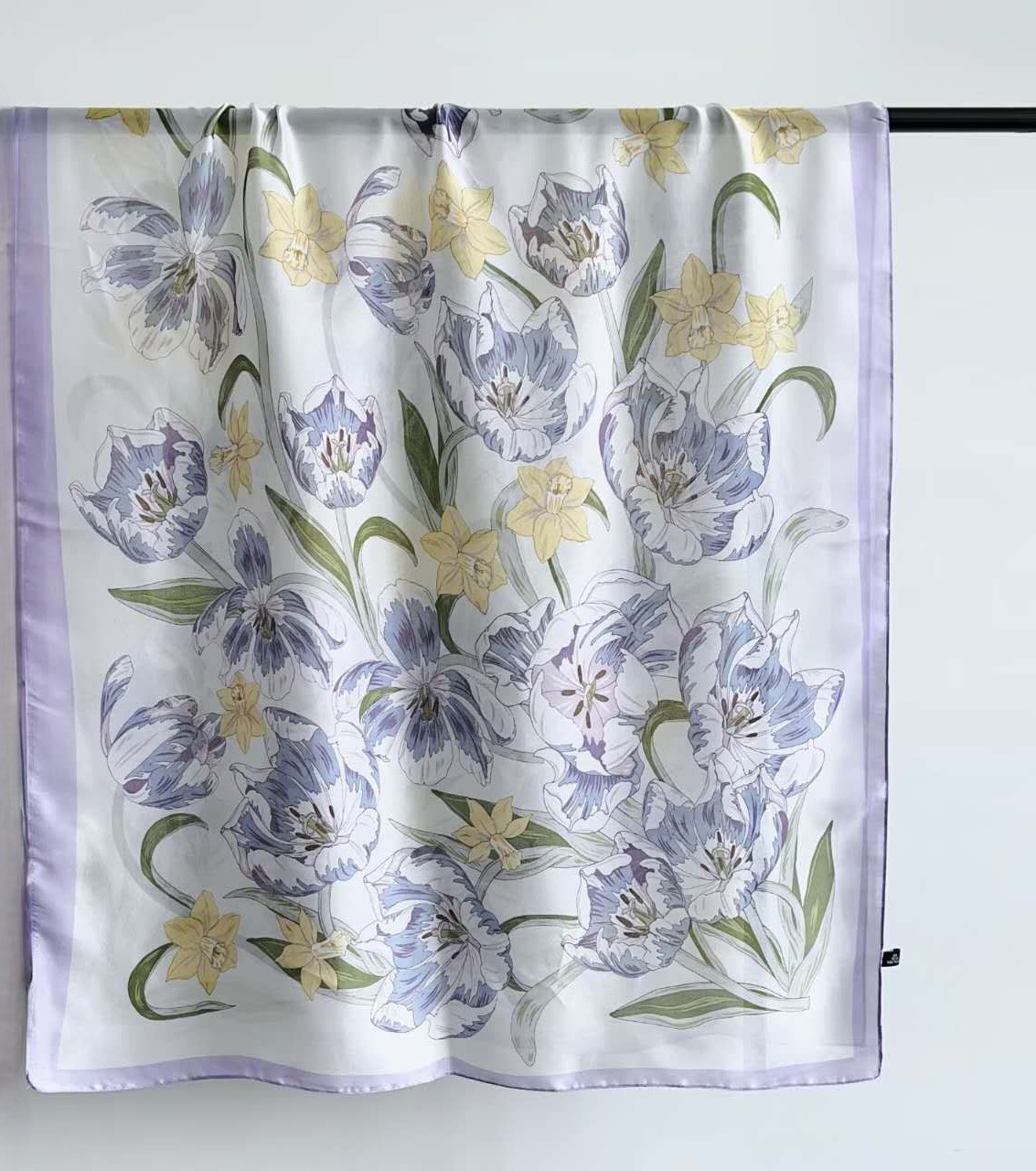 the silky scarf features a delicate floral pattern of tulips and daffodils, set against a soft, light background, framed by a lavender border.